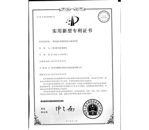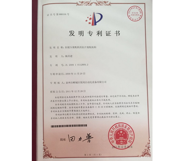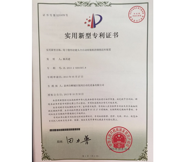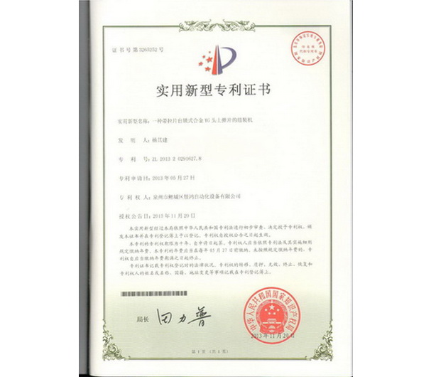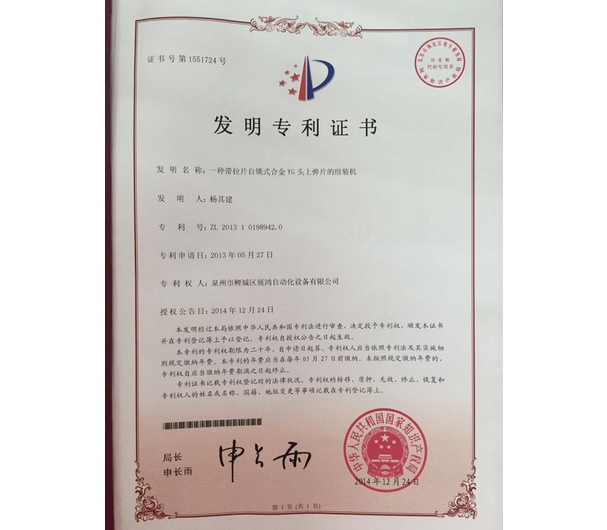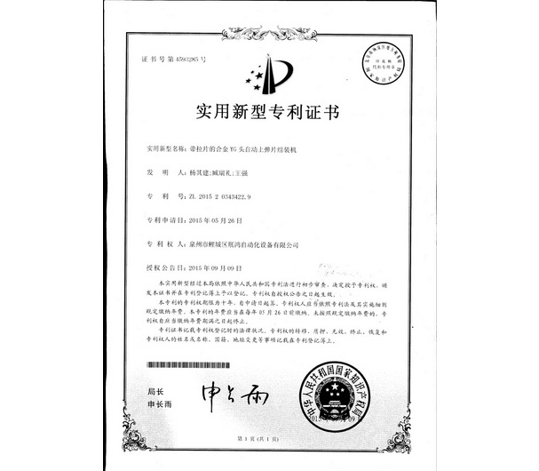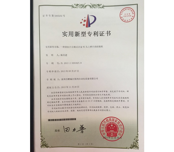 YG頭專利證書